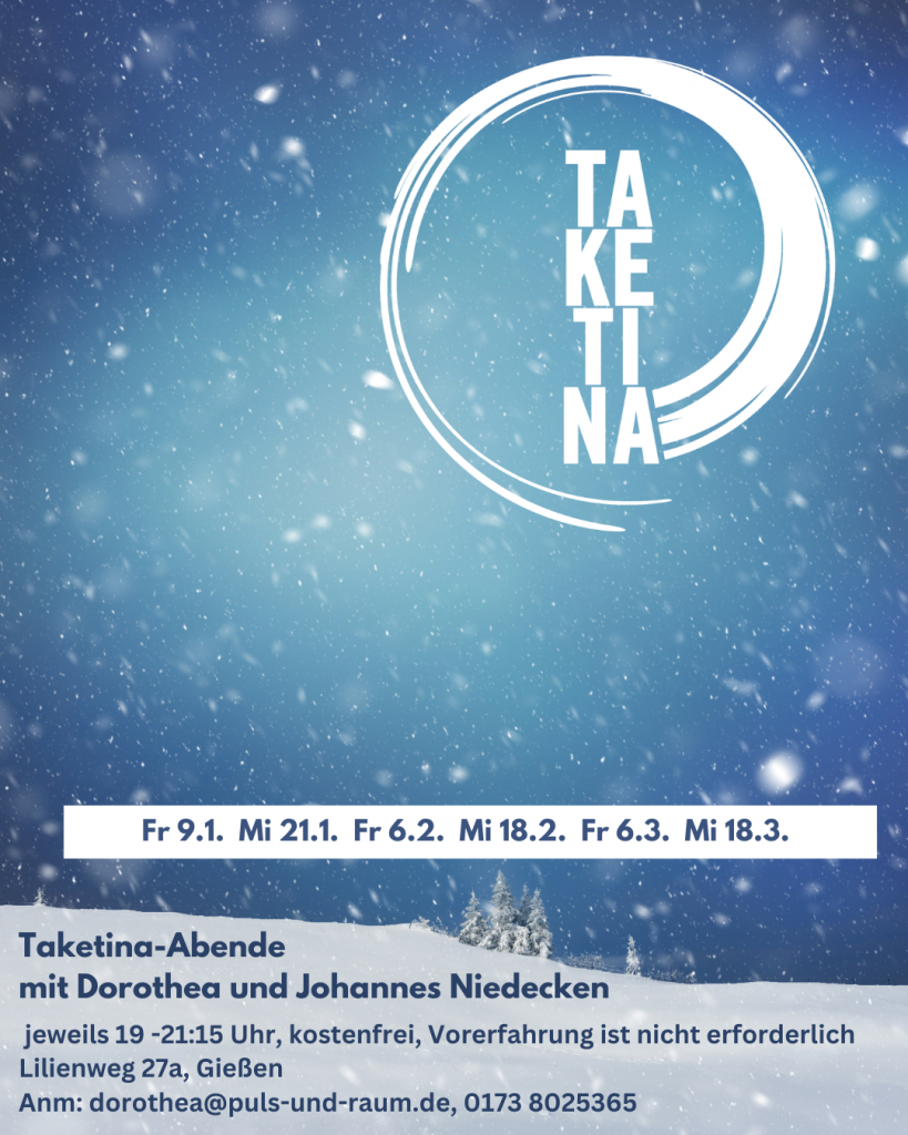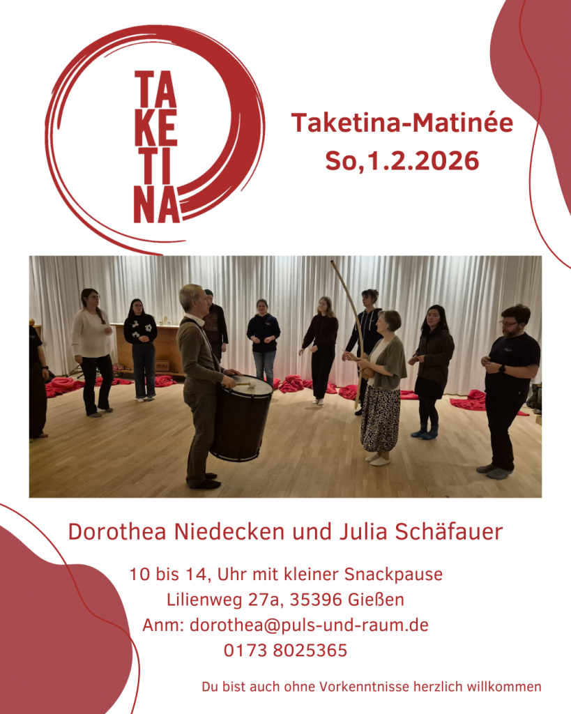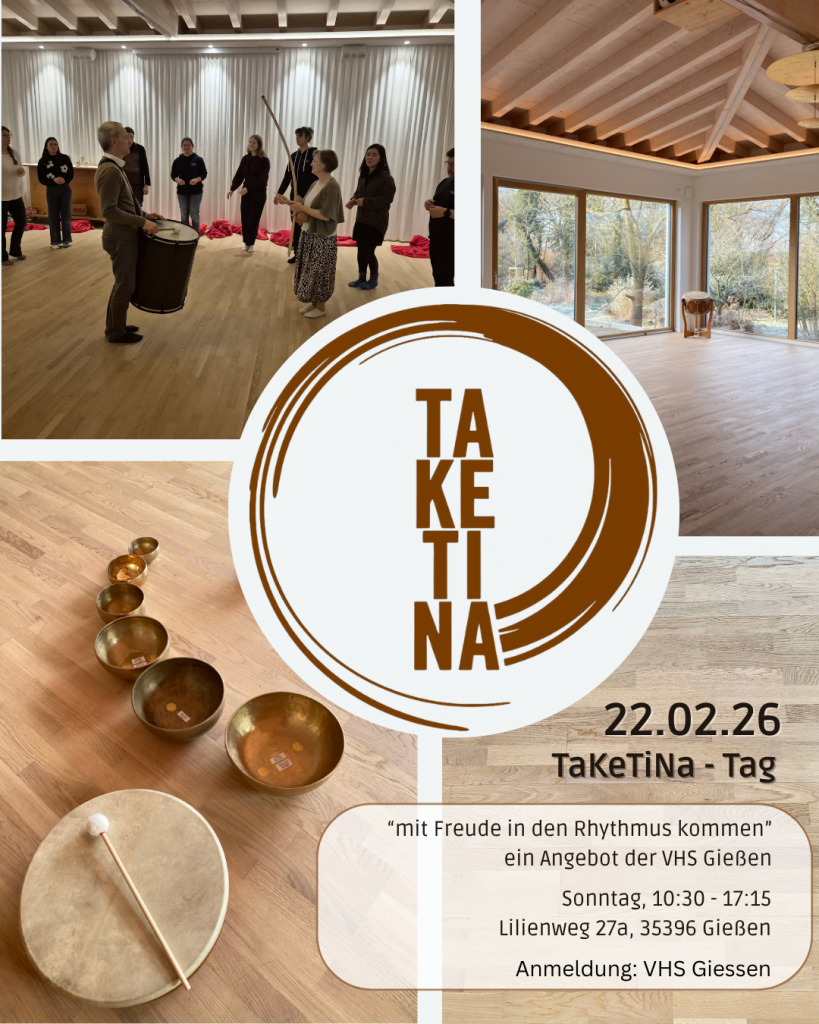Und in Zusammenarbeit mit der VHS Gießen biete ich einen Taketina-Tag an, und zwar am Sonntag, den 22. Februar von 10:30 – 17.15 Uhr. Wenn Du daran Interesse hast, melde Dich bitte direkt bei der Volkshochschule an: VHS Gießen – Taketina-Tag.