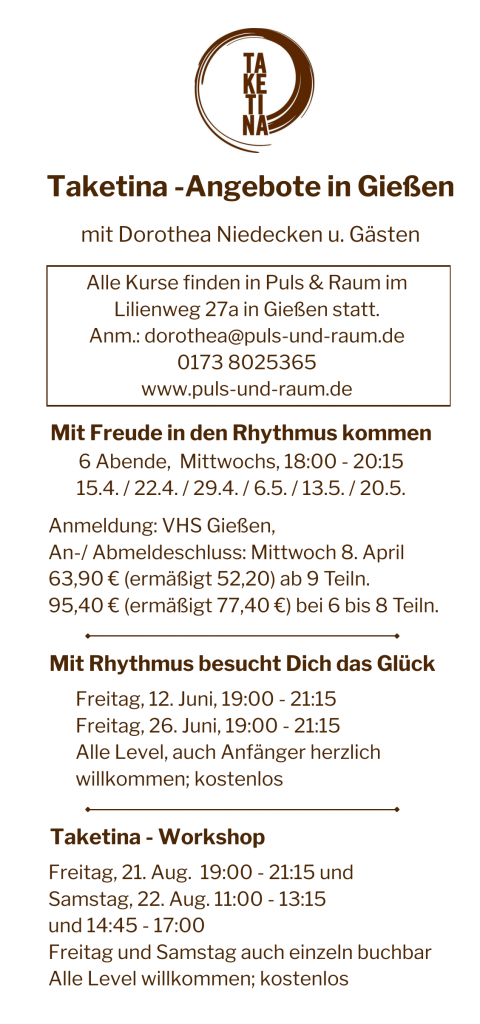Die nächsten sechs Taketina-Abende biete ich in Zusammenarbeit mit der VHS Gießen an, wöchentlich aufeinanderfolgend ab Mittwoch, 15. April, jeweils von 18 – 20.15 Uhr. Wenn Du daran Interesse hast, melde Dich bitte direkt bei der Volkshochschule an: VHS Gießen – TaKeTiNa – Mit Freude in den Rhythmus kommen.